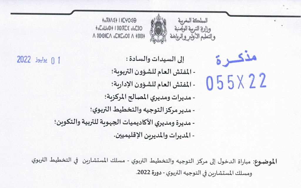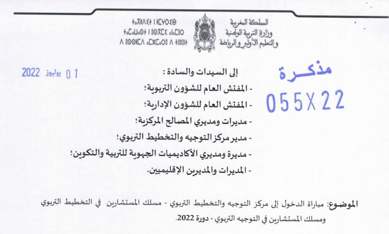 أصدرت وزارة التربية الوطنية والتعليم الأولي والرياضة المذكرة رقم 055×22 بتاريخ 01 يوليوز 2022 التي تعلن فيها عن تنظيم مباراة الدخول إلى مركز التوجيه والتخطيط التربوي – دورة 2022 لمسلكي التوجيه التربوي والتخطيط التربوي.